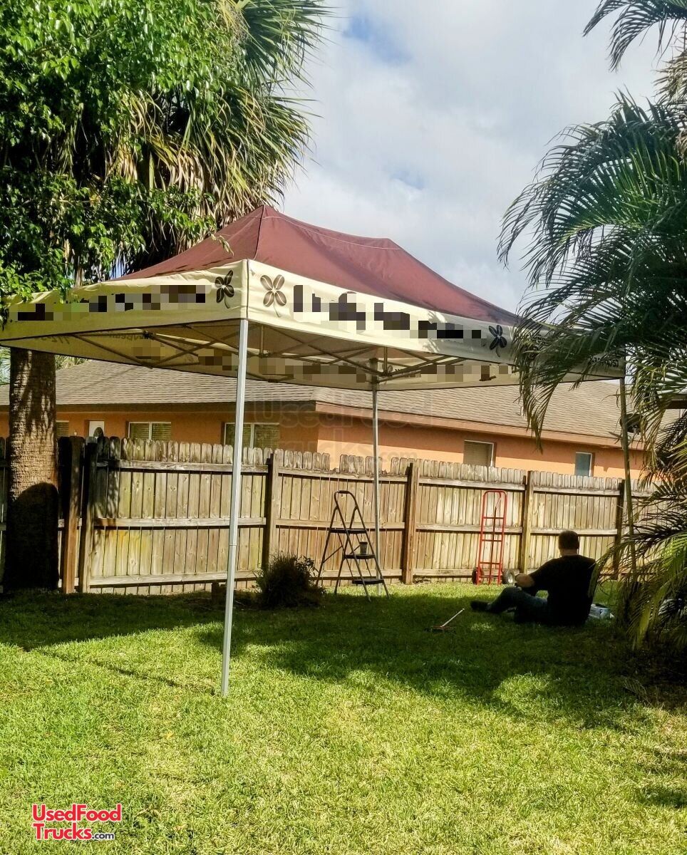 - 10'x15' weather resistant portable canapy, 2 wooden bistro tables with 4 chairs