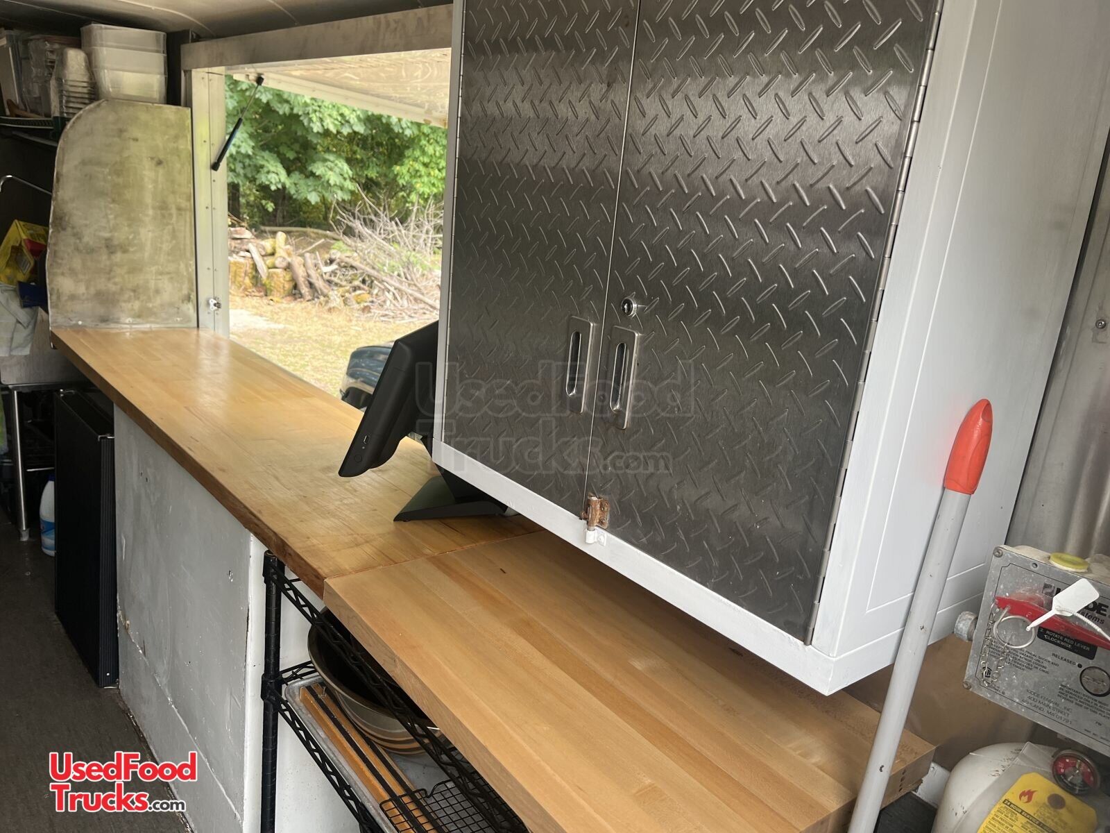 - Work Table: interior 7-1/2’ long butcher block serving / prep counter