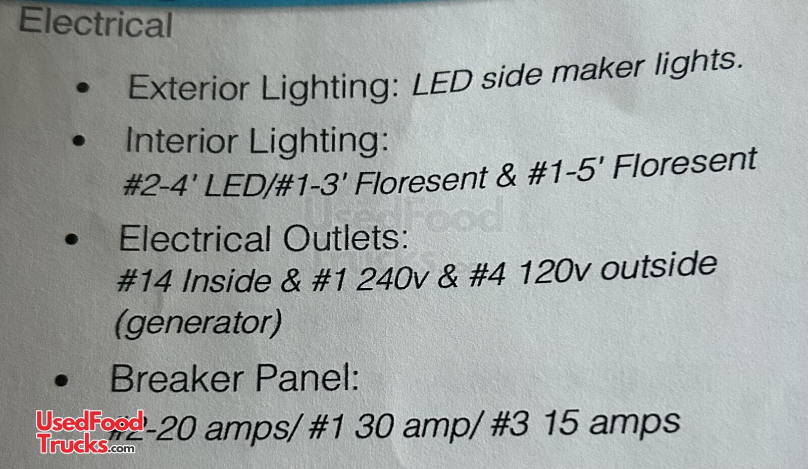 - Interior Lighting: 2 - 4' LED/#1-3' Floresent & #1-5 Floresent